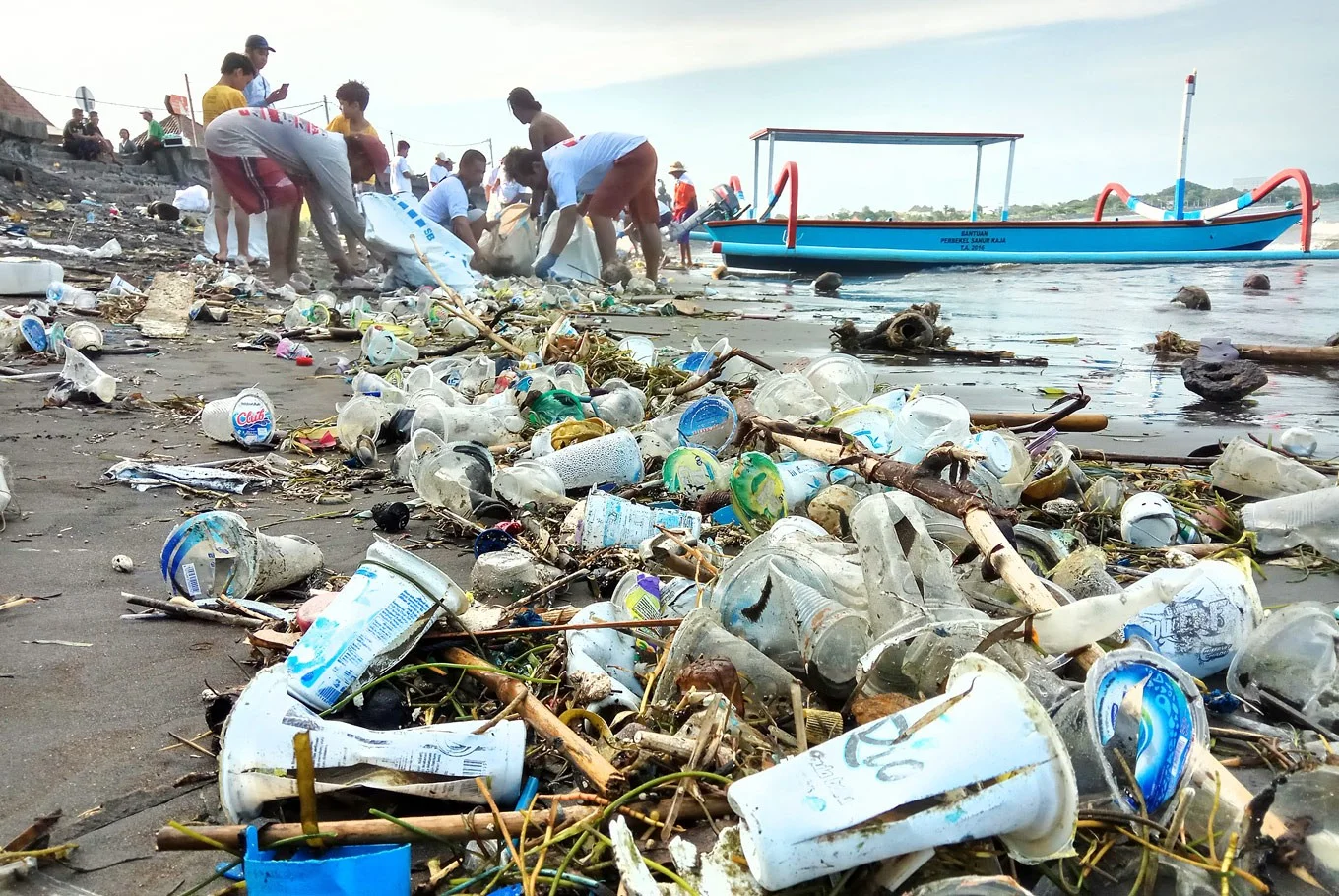 People living near Matahari Terbit Beach in Sanur, Bali, work together to clear trash, mainly plastic bottles and food packaging, from the beach. (JP/Zul Trio Anggono)