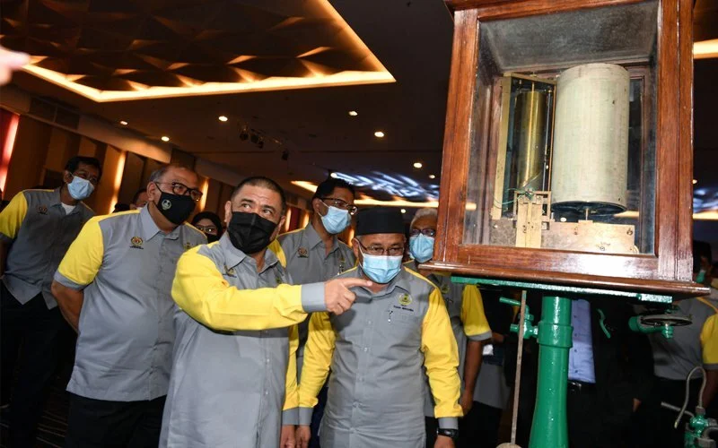 Saarani Mohamad (third from left) and Tuan Ibrahim Tuan Man looking at a water measuring equipment during the World Water Day celebrations in Perak. (Bernama pic)